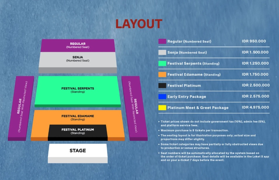 Harga tersebut belum termasuk pajak 10% dan biaya platform. Nomor kursi akan diberikan saat pembelian untuk kategori tempat duduk.